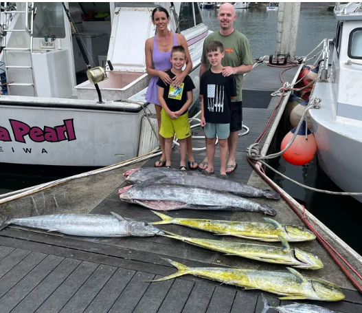 We invite you to fish aboard the Pamela Pearl, a 35′ Bertram fishing vessel. Our home port, Haleiwa, O’ahu has some of the most consistent and productive fishing in all of Hawaii. We welcome everyone aboard to come enjoy one of the hottest Oahu fishing charters on this island. We have excellent fishing all year long and Oahu has numerous different species of fish moving in and out of Haleiwa waters. On our Oahu deep sea fishing charters, we target 5 main species of fish: Marlin, Mahi Mahi, Ono, Yellowfin (ahi), and Skipjack Tuna (Aku), all of which are very delicious fish to eat. Our nearshore bottom fishing charters provide an opportunity to target more than a dozen species of fish that are found in our local waters. We are setup for family fishing charters, serious sportfishing charters for anglers looking to catch a dream fish, and first-time fishing groups that are in Oahu on vacation and looking for a new experience. Please contact Pearl Fishing for your next Oahu fishing charter.